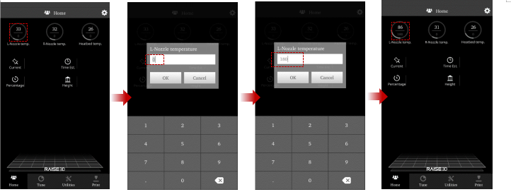 3. Open the ‘Home’ tab and click on the ‘Nozzle Temperature’. In the new window, set the temperature for both nozzles to 0, and press ‘OK’. Allow the components to cool down.
