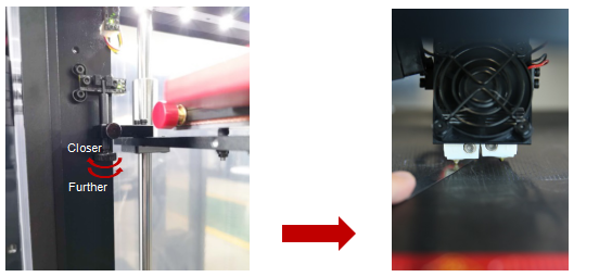 To adjust the nozzle height, rotate the large thumbscrew as depicted in the diagram.