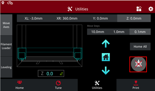 3. Click the “Motor Disable” button. Then move the extruder which needs to replace the nozzle to be placed in a central position.