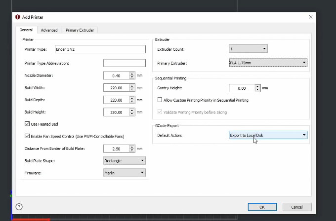 And for the nozzle diameter, this is very important. I know that my Ender-3 has a 0.4 mm nozzle. And it is also very important to set the build volume. In the case of the Ender-3, it’s 220mm * 220mm on the X and the Y, and the belt height is 250mm.