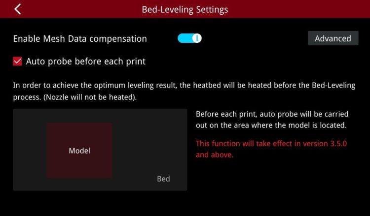 (4) Click on “Settings” to enter the Auto-leveling setting page. The functions “Enable Mesh Data Compensation”, “Auto probe before each print” was added in the setting page. The functions “Turn off leveling compensation when using Raft”, “Heat up the heatbed before leveling” was added in the advanced settings, as shown below: